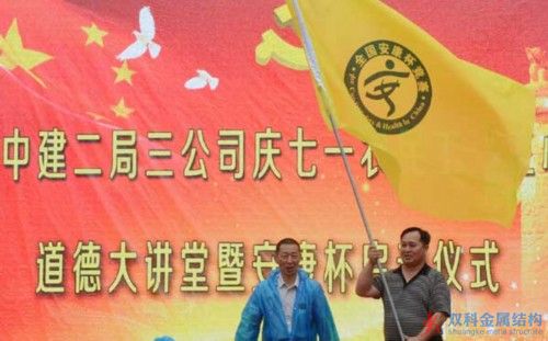 活動(dòng)過(guò)程中,中建二局三公司十堰萬(wàn)達(dá)項(xiàng)目部工地開(kāi)展了慶“七一”農(nóng)民工“三心”(自信心、責(zé)任心、進(jìn)取心)道德教育,同時(shí)啟動(dòng)了2015年“安康杯”活動(dòng)。十堰市總工會(huì)對(duì)中建二局進(jìn)行了授旗。