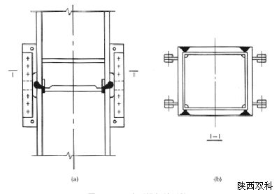 鋼粱:鋼梁的種類較多,有普通鋼粱、吊車粱、單軌鋼吊車梁、制動粱等。截面以工字形居或用鋼板焊接,也可采用桁架式鋼梁、箱開梁或貫通型粱等。如圖是工字形梁與箱開柱的連接圖。