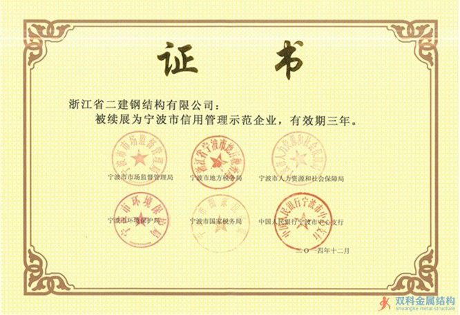 根據(jù)甬市監(jiān)信用[2014]174號文件,經(jīng)寧波市信用管理示范企業(yè)考評認定小組的考核測評,鋼結(jié)構(gòu)公司被續(xù)展為寧波市信用管理示范企業(yè),有效期三年。![]() |